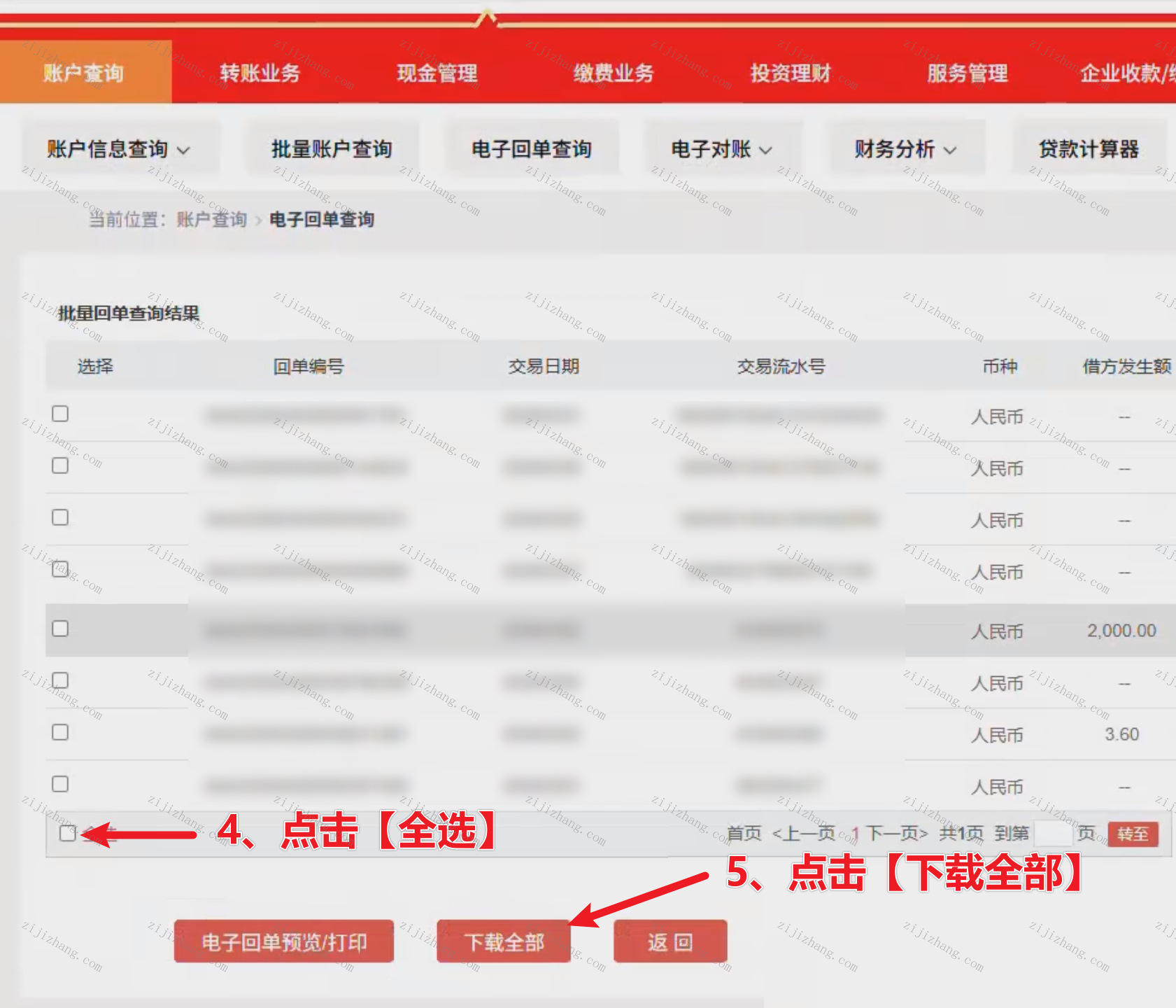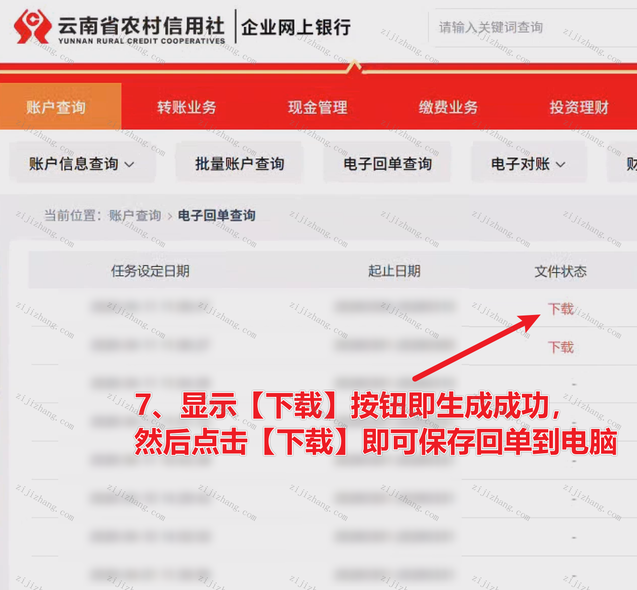 5、点击对应回单生成记录的【下载】按钮,即可将电子回单保存到桌面(对应下图数字7操作步骤)