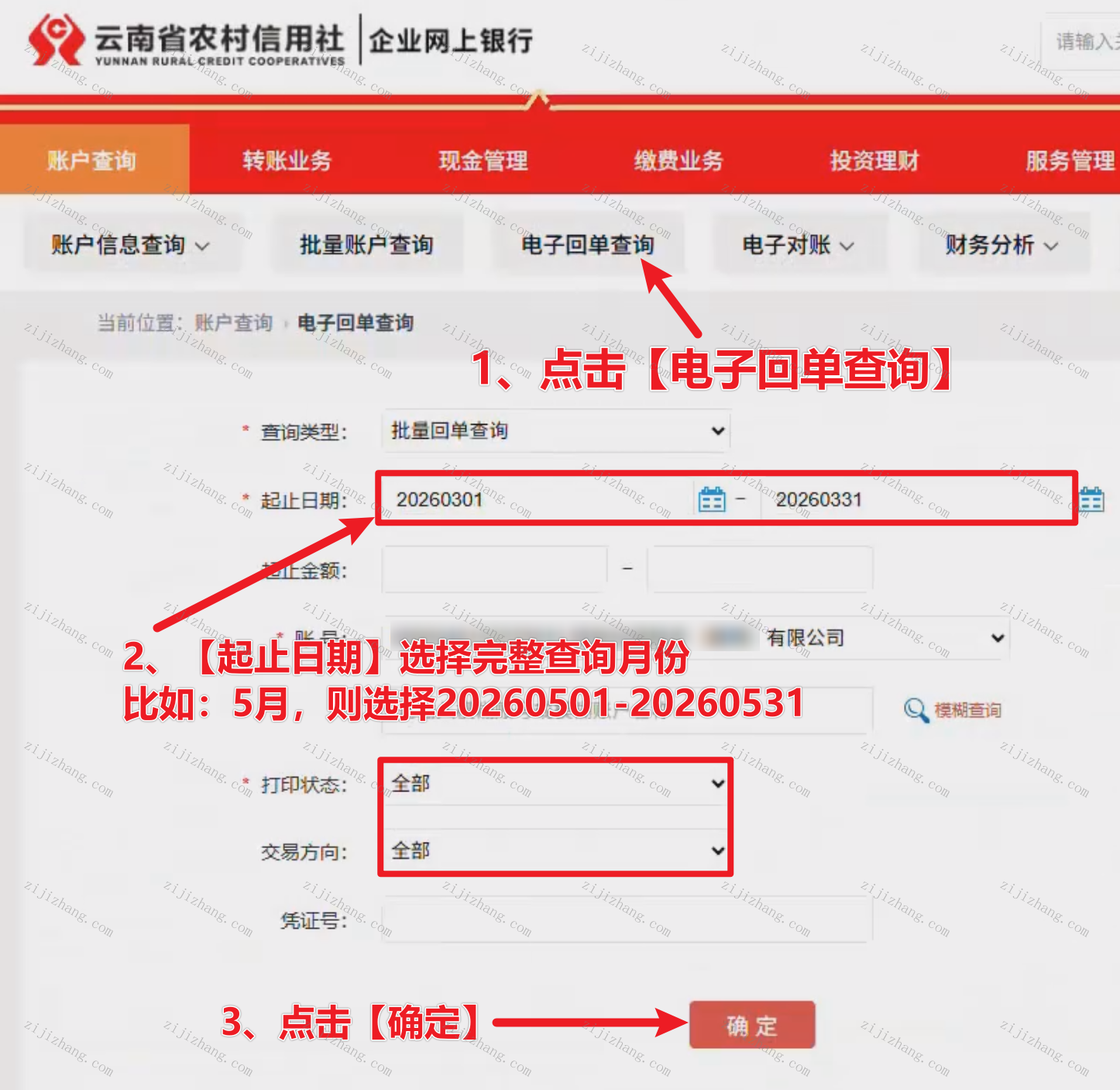 2、点击【电子回单查询】,【起止日期】选择需要查询导出的完整月份,(比如:7月,7月1日~7月31日),点击【确定】(对应下图数字1-3操作步骤)