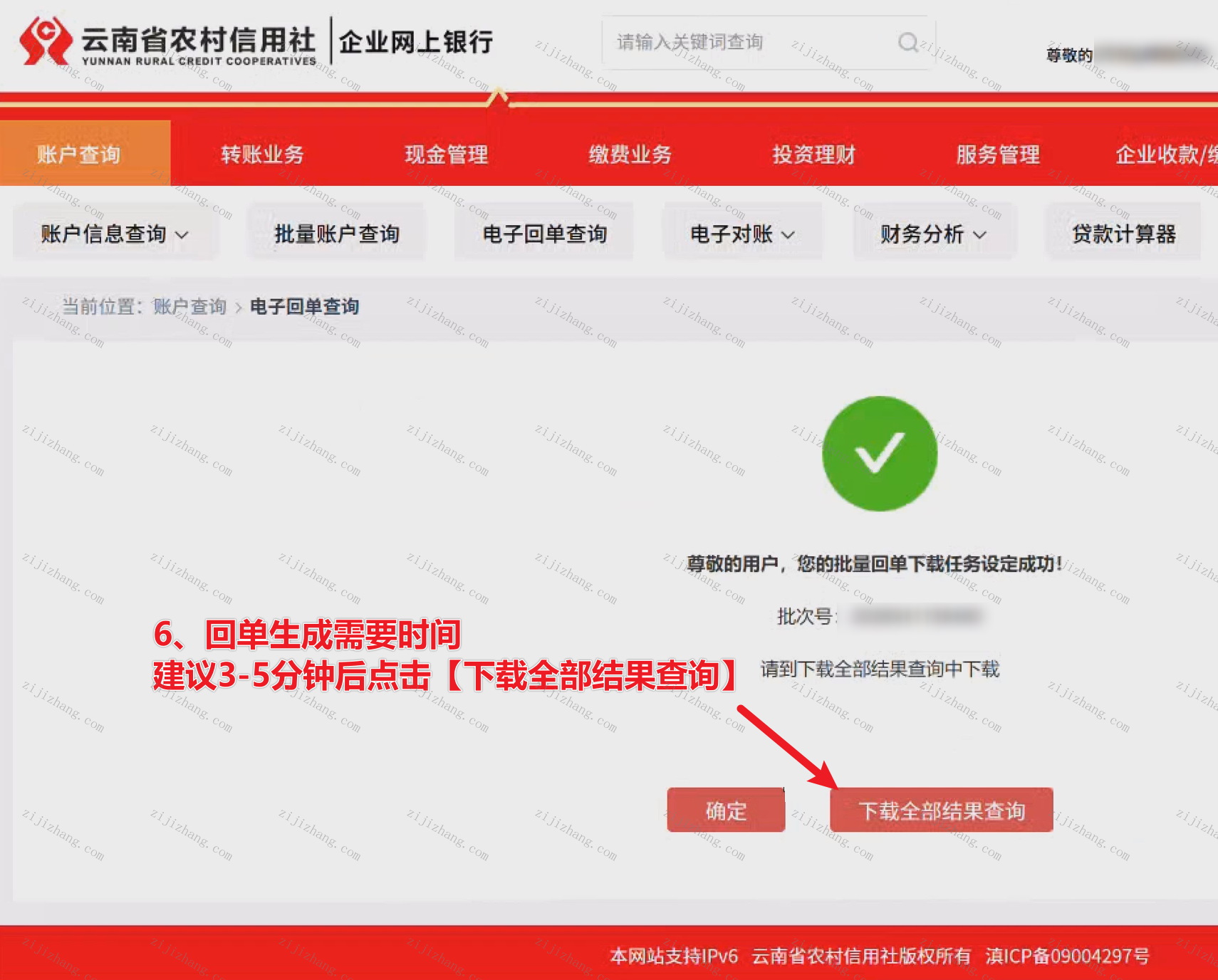 4、显示任务设定成功后,因回单生成需要时间,建议您等待3-5分钟后,点击【下载全部结果查询】(对应下图数字6操作步骤)